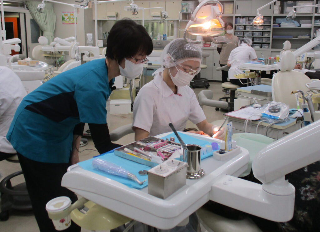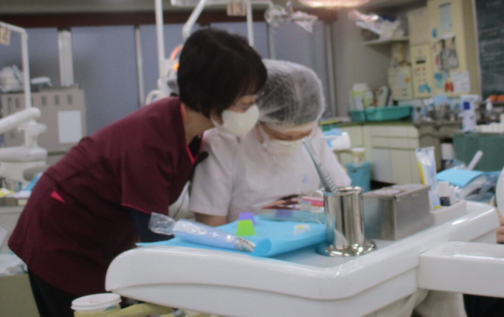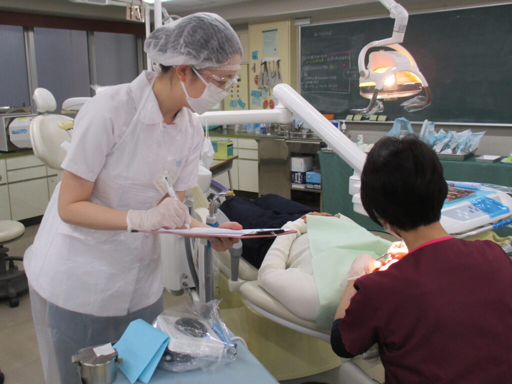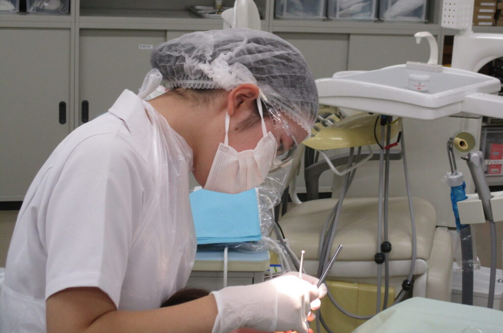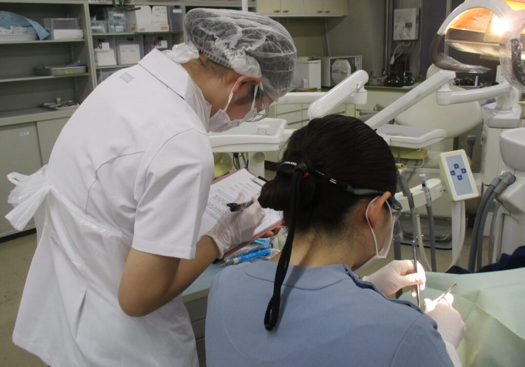 医療面接から始まり、口腔内診査、歯牙の染色をし患者さんに口腔内の状態を説明しました。その後はスケーリング、歯面研磨をし最後に患者さんに合った歯ブラシと補助的清掃用具を選び、ワンポイントアドバイスをしました